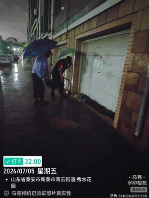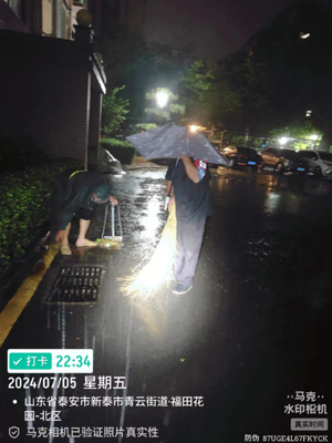 嚴(yán)陣以待巡查到位。7月5日夜間,強(qiáng)降雨持續(xù),物業(yè)公司各項(xiàng)目負(fù)責(zé)人堅(jiān)守崗位,冒雨逆行,反復(fù)對(duì)小區(qū)內(nèi)車庫出入口、地下車庫、各排水口等重點(diǎn)部位逐一檢查,徐經(jīng)理親自到各項(xiàng)目(小區(qū))巡查,并對(duì)值班人員強(qiáng)調(diào)要隨時(shí)監(jiān)控暴雨動(dòng)態(tài),切實(shí)做好24小時(shí)值守工作。巡查工作一直持續(xù)到6日凌晨,為廣大業(yè)主排除了安全隱患,展現(xiàn)了華通人關(guān)鍵時(shí)刻挺身而出的責(zé)任與擔(dān)當(dāng)。