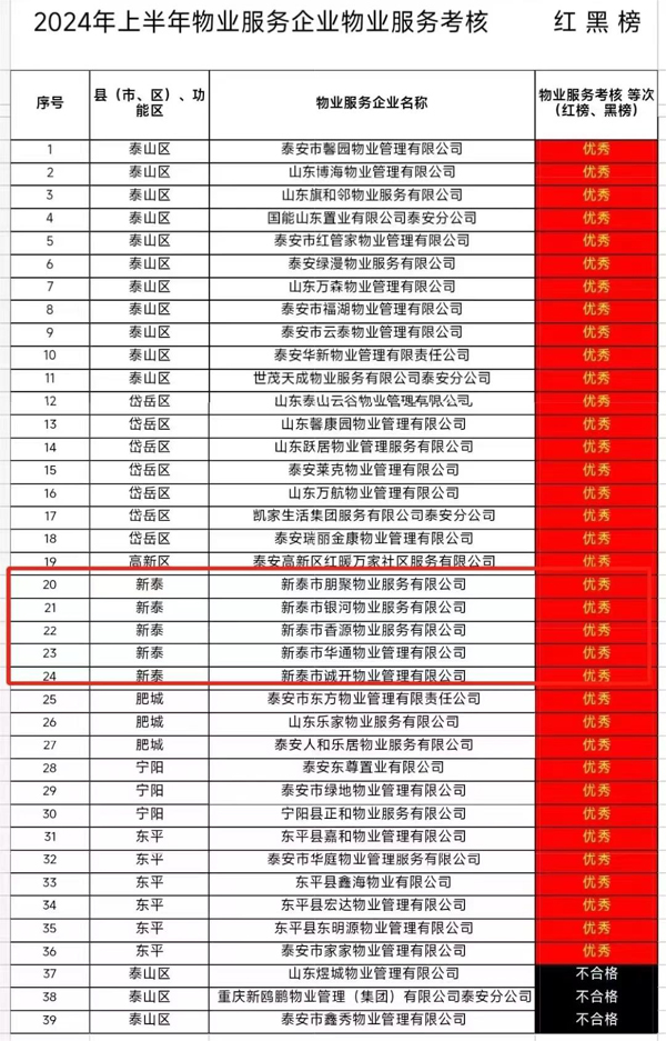 7月30日,泰安市房產(chǎn)管理服務(wù)中心發(fā)布泰安市2024年上半年物業(yè)服務(wù)企業(yè)物業(yè)服務(wù)考核紅黑榜,新泰市華通物業(yè)管理有限公司榮登紅榜,物業(yè)服務(wù)榮獲優(yōu)秀等級(jí)。