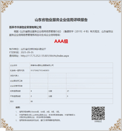 9月4日,泰安市房管中心發(fā)布泰安市2025年第二季度物業(yè)服務(wù)企業(yè)信用等級(jí)結(jié)果,根據(jù)《山東省物業(yè)服務(wù)企業(yè)信用信息管理辦法》(魯建物字【2019】4號(hào))有關(guān)規(guī)定,在山東省物業(yè)服務(wù)企業(yè)信用信息管理系統(tǒng)生成的企業(yè)信用等級(jí)中,新泰市華通物業(yè)管理有限公司喜獲“AAA級(jí)”等級(jí)認(rèn)證。